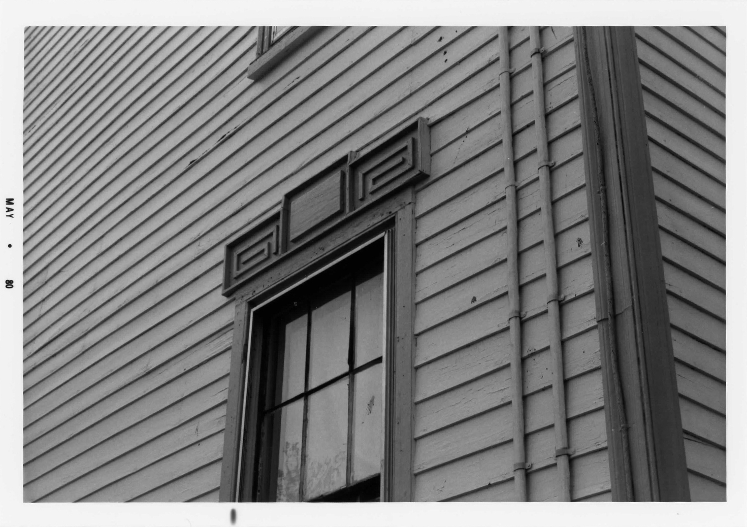 Window surrounds with simple fretwork and raised keystones, somewhat